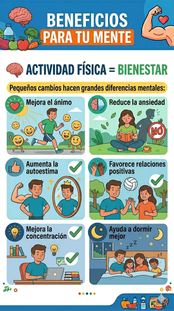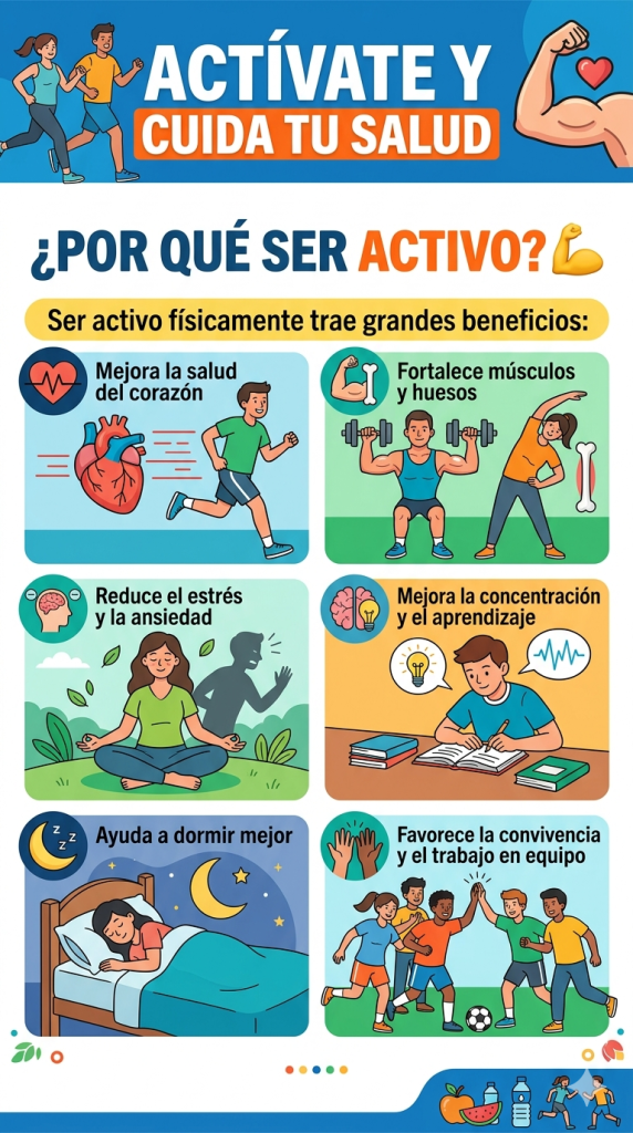 Este recurso, presentado en formato de infografías, tiene como objetivo promover y educar sobre los beneficios de realizar actividad física de manera regular, como parte de los hábitos de vida saludable, un sello que distingue a nuestra comunidad educativa.